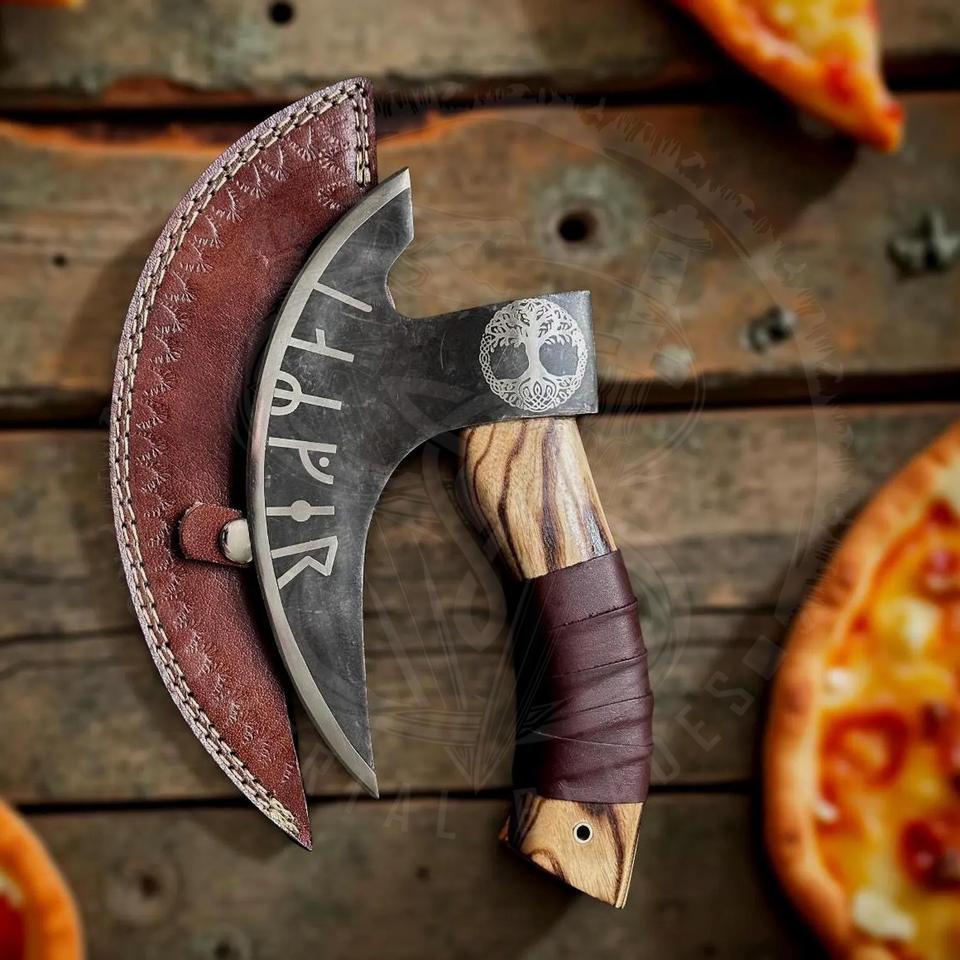 Cortador de Pizza de Alta Calidad, Mini Hacha con Mango de Madera de Fresno y Funda de Cuero, Cortador de Pizza para Exteriores, Hachas de Cocina