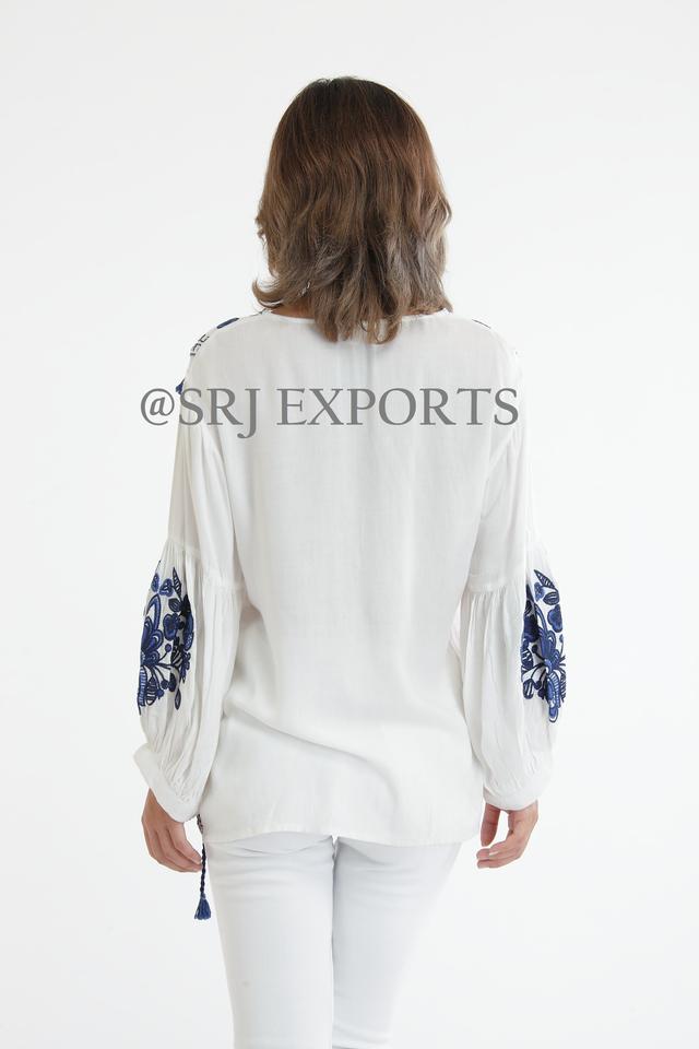 Alta calidad Plus tamaño blanco y azul elegante contraste blusa Top Aari bordado manga linterna borla decoración blusa de las mujeres