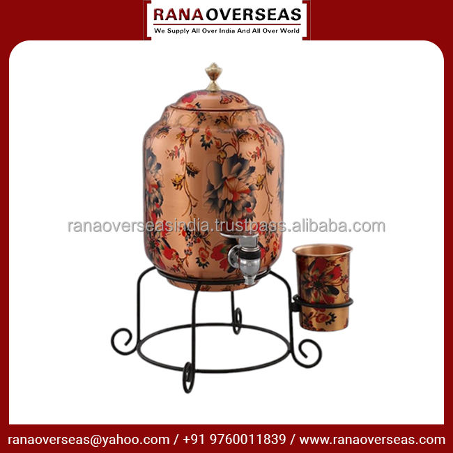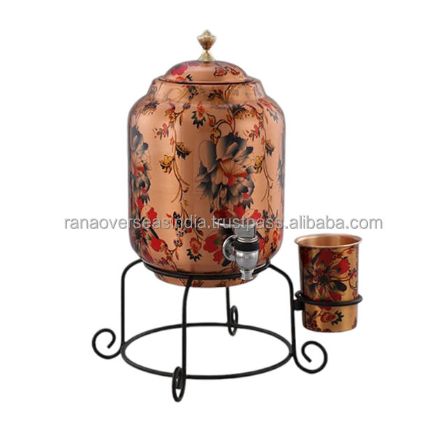 Tanque de almacenamiento de agua de cobre con diseño Floral impreso de alta calidad con soporte de hierro de vidrio y metal tamaño y forma personalizados olla de agua