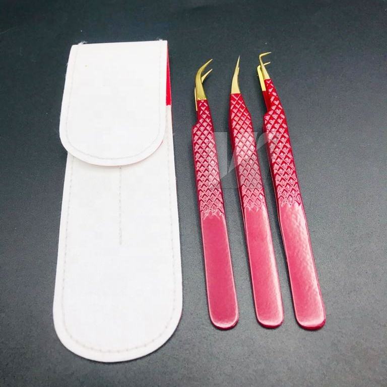 Pinzas de extensión de pestañas de acero inoxidable con logotipo personalizado profesional de alta calidad, Punta puntiaguda de oro rosa rojo, tipo de fibra de volumen