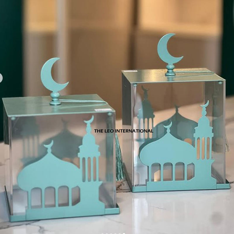 Decoraciones de Ramadán de Alta Calidad, Recipiente Decorativo con Tapa de Diseño Lunar para Interiores, Color Azul Cielo