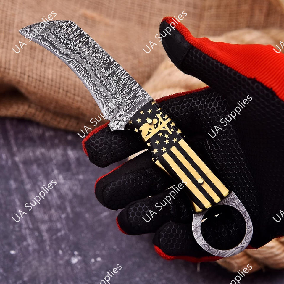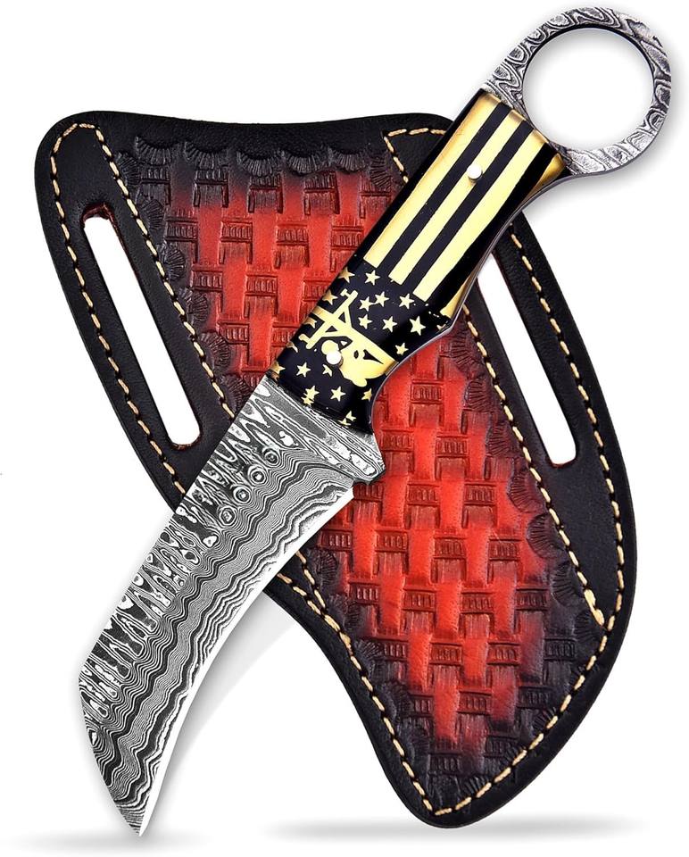 Cuchillo de Caza de Acero de Damasco de Alta Calidad, Afilado como una Navaja, de Grado Industrial, con Hoja Fija Tipo Pico de Halcón, para Campismo al Aire Libre, con Orificio para el Dedo, con Funda de Cuero