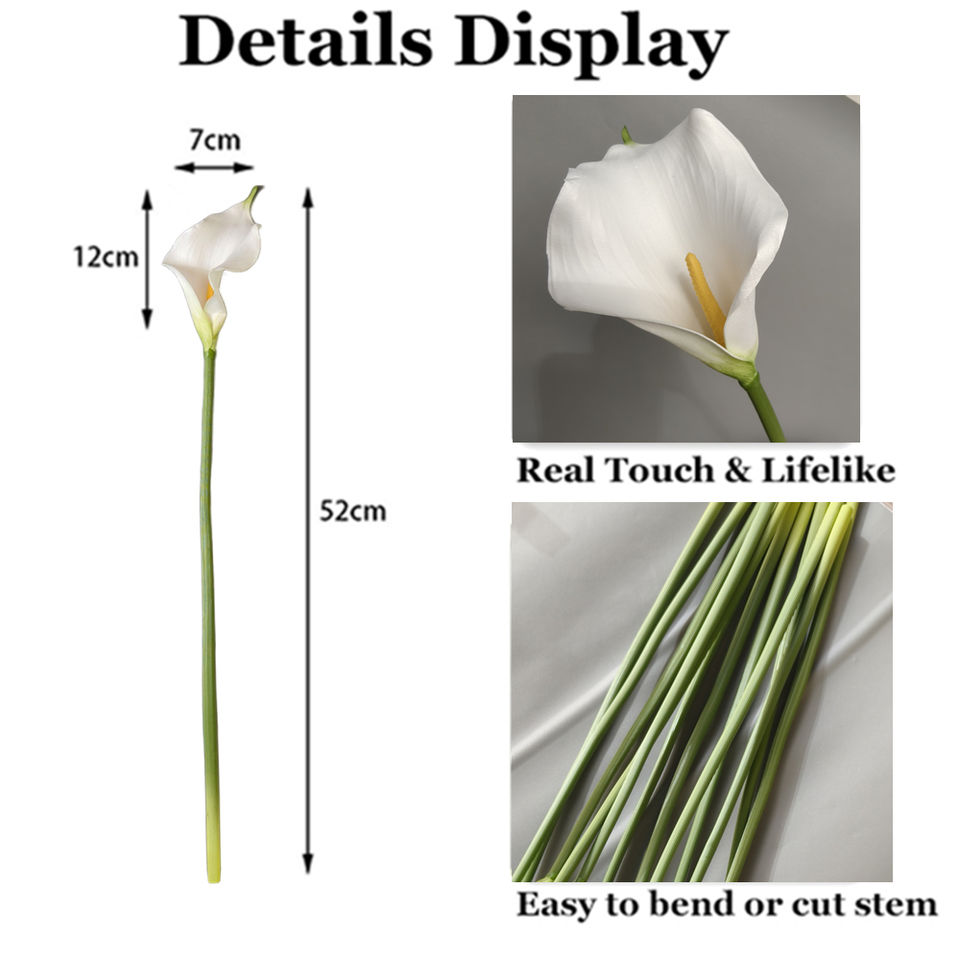 Material EVA: Elaboradas con EVA de alta calidad, estas calas artificiales ofrecen una textura ultrarrealista que imita la sensación de las flores frescas.