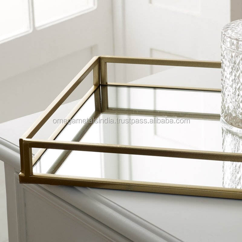 Bandeja de cuerpo de vidrio de forma rectangular de alta calidad con borde de metal con acabado dorado para vajilla de lujo