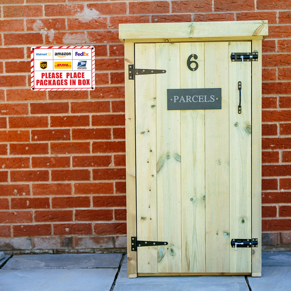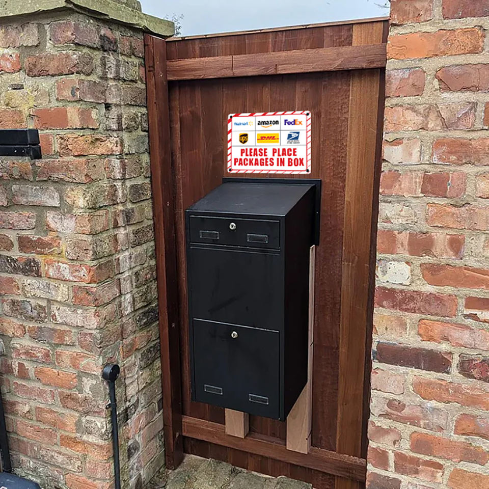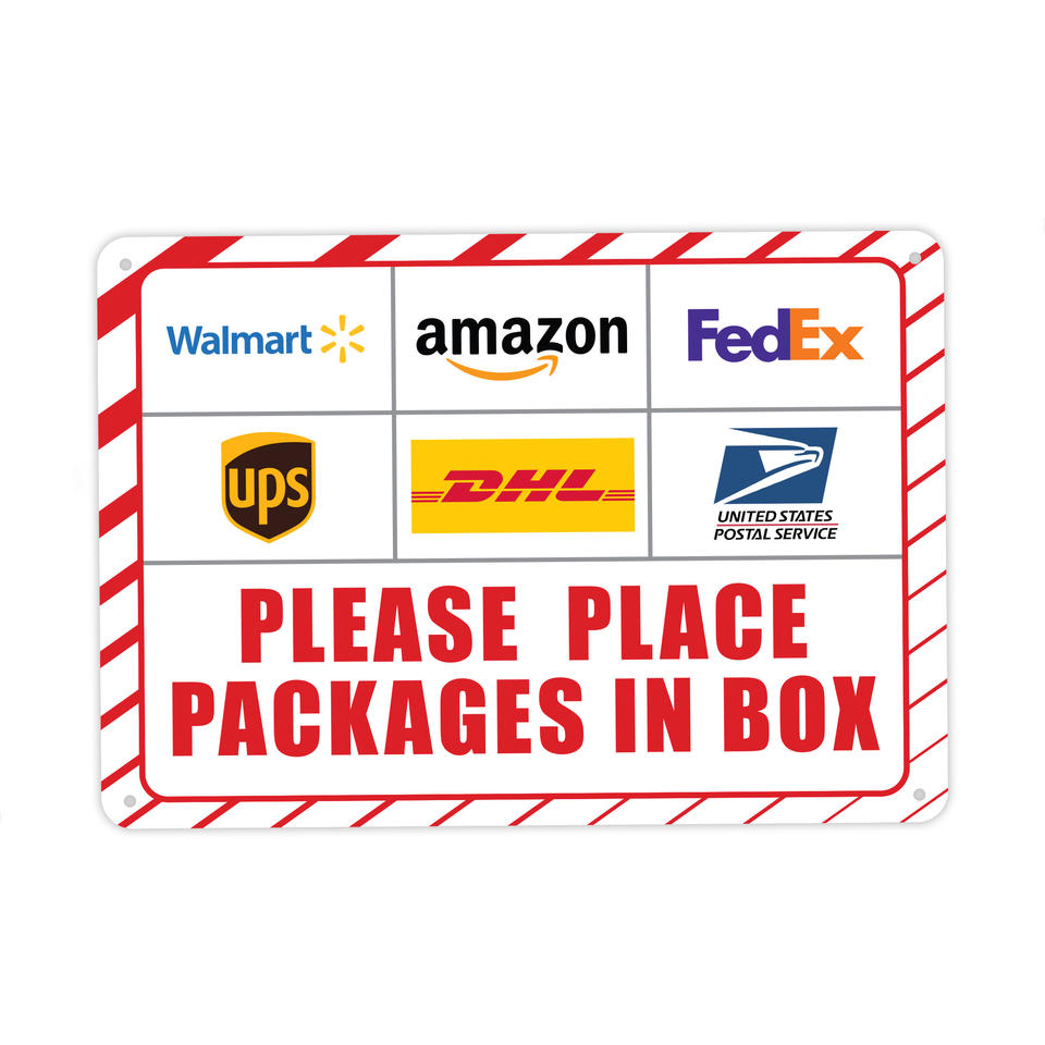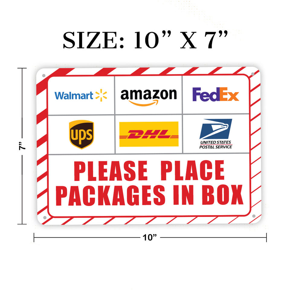Señal de entrega de paquete rojo de alta calidad, pegatina de aluminio | Diseño industrial | Rectángulo | 10x7 | Resistente a la decoloración | Comercial