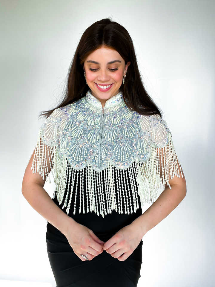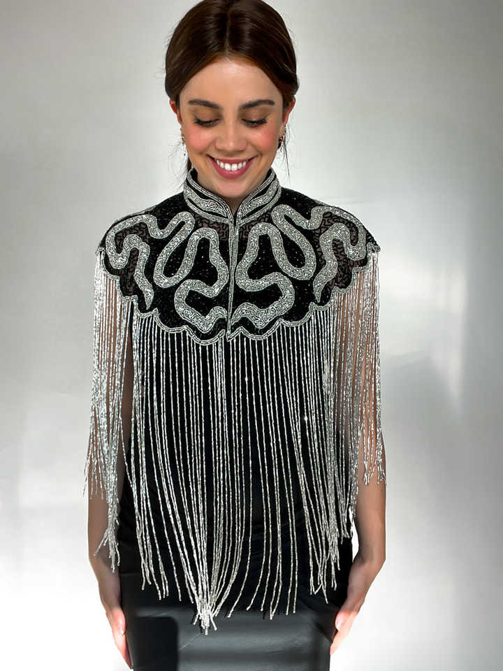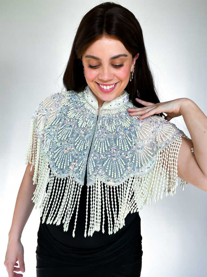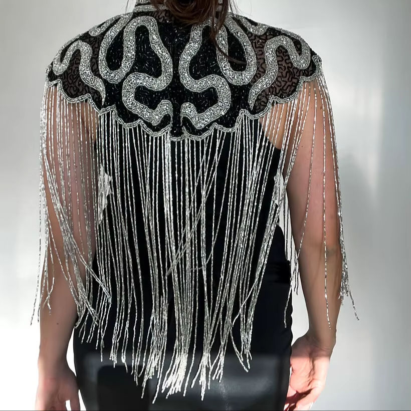 Borla de Cuentas de Cristal de Alta Calidad con Pedrería y Flecos de Encaje