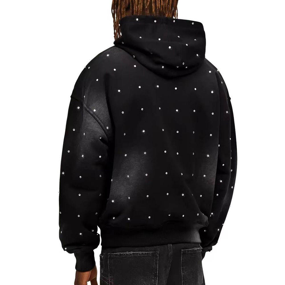 Sudadera con Capucha y Cremallera de Alta Calidad con Estampado de Diamantes de Imitación, Logotipo Personalizado, Peso Pesado, 100% Algodón, Lavado Ácido, Ropa Urbana para Hombre
