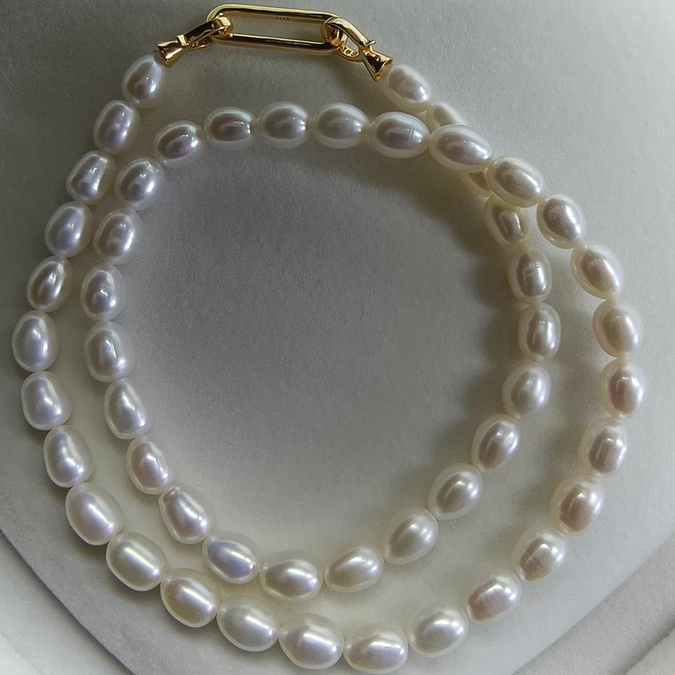 Collar de Perlas de Alta Calidad con Hebilla de Plata S925, Cuentas de Arroz Pequeñas de 5-6 mm, Sin Semillas, Juvenil y Elegante
