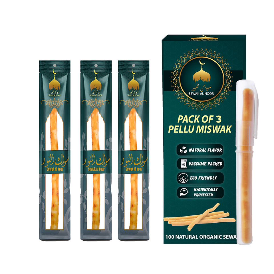 Palitos de Miswak Sewak Noor de Alta Calidad, 100% Naturales, Orgánicos y Biodegradables, Paquete de 3