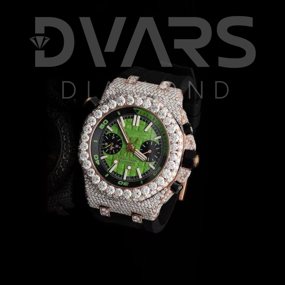 Reloj Analógico Automático de Acero Inoxidable con Diamantes de Alta Calidad, Totalmente Engastado, con Alarma, 41 mm, VVS, Moissanita, Verde, Blanco y Dorado