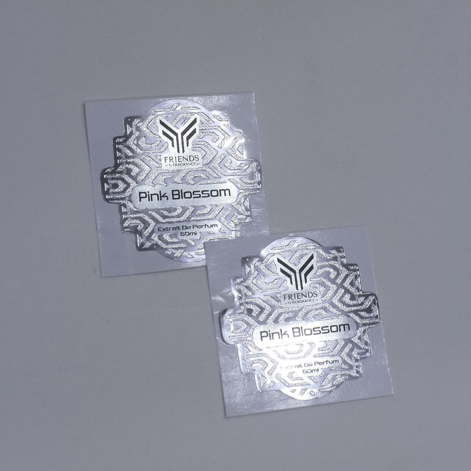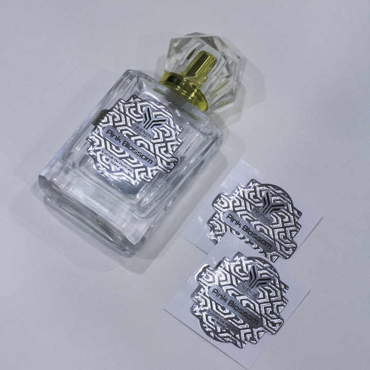 Adhesivo de PVC metalizado cromado plateado de alta calidad, marca única, impermeable, etiquetas de embalaje de Perfume en relieve, cuidado de la piel duradero