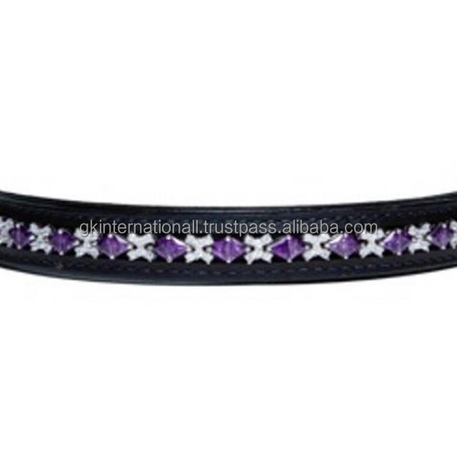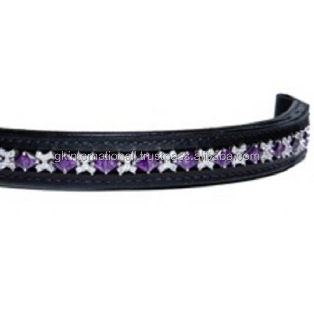 Banda de ceja de caballo de cuero de canal vacío acolchado suave de alta calidad con incrustaciones de cristales de pirámide púrpura y Blanca banda de ceja de cadena ostentosa
