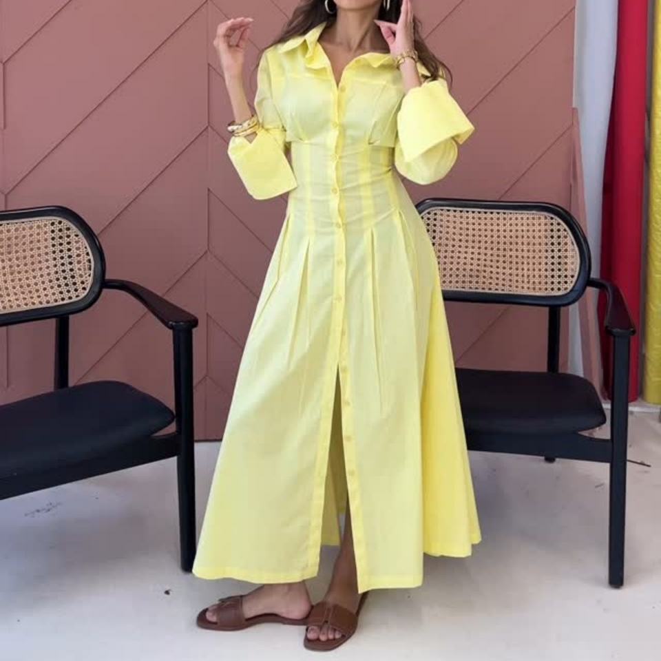 Vestido Camisero Largo de Lino/Algodón con Estampado Floral para Mujer, Cuello Camisero, Corte Imperio, Primavera/Otoño, Alta Calidad