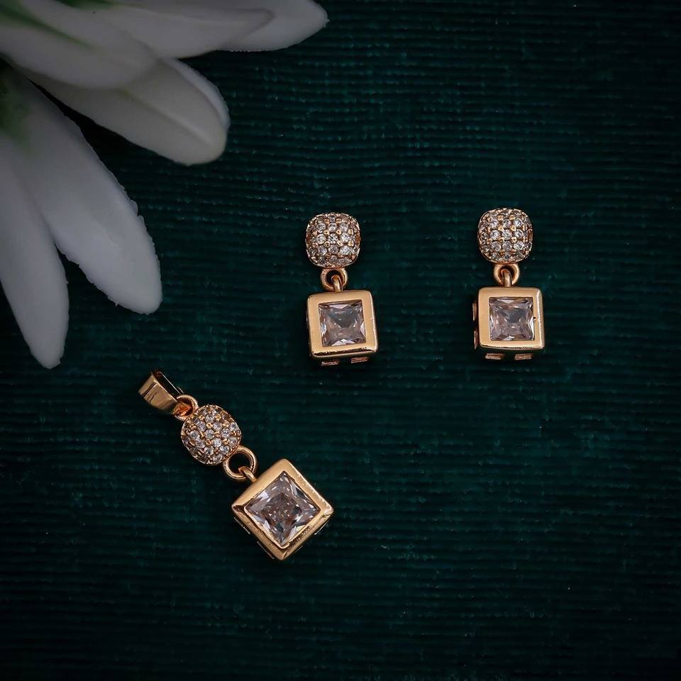 Conjunto de Collar con Colgante Cuadrado de Alta Calidad con Aretes, Chapado en Oro, Acero Inoxidable con Elegantes Piedras de Circonia Cúbica, Estilo Moderno