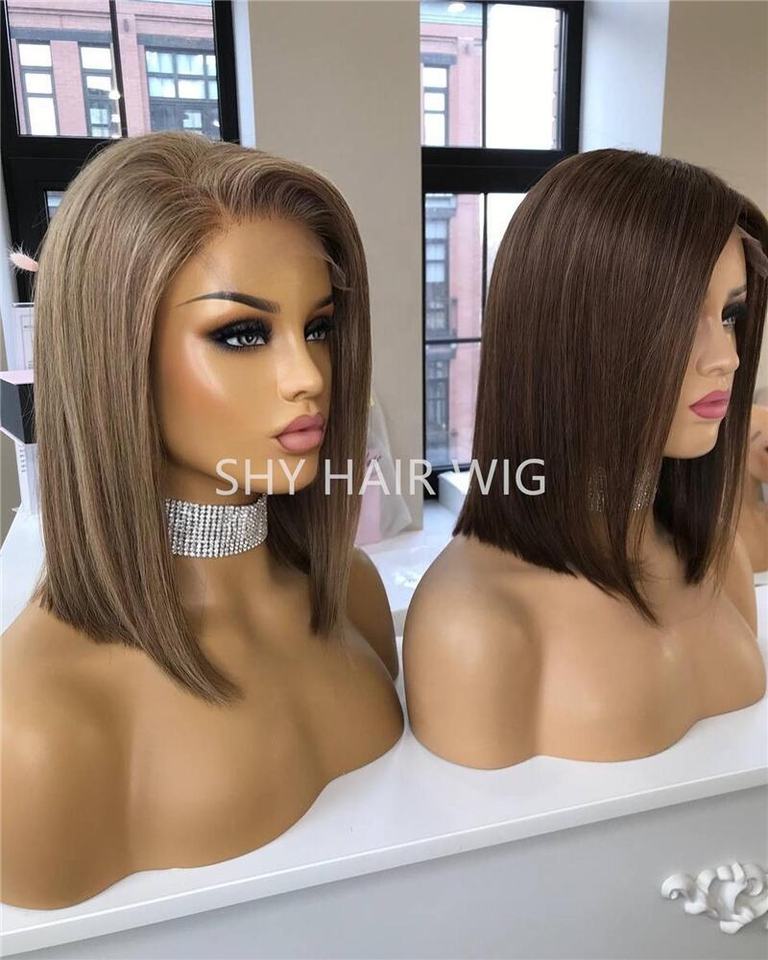 Peluca Bob de Encaje Frontal Recto de Alta Calidad, Cabello Humano Europeo, Color Marrón, Parte Superior de Seda, Nudos Pequeños, para Mujer Blanca, Pelucas de Encaje Frontal de Alta Gama