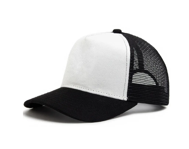 Sombrero en blanco sólido de 5 paneles de gamuza de alta calidad, gorra de camionero curvada estructurada con logotipo personalizado de malla negra para hombres y mujeres, para correr en todas las estaciones