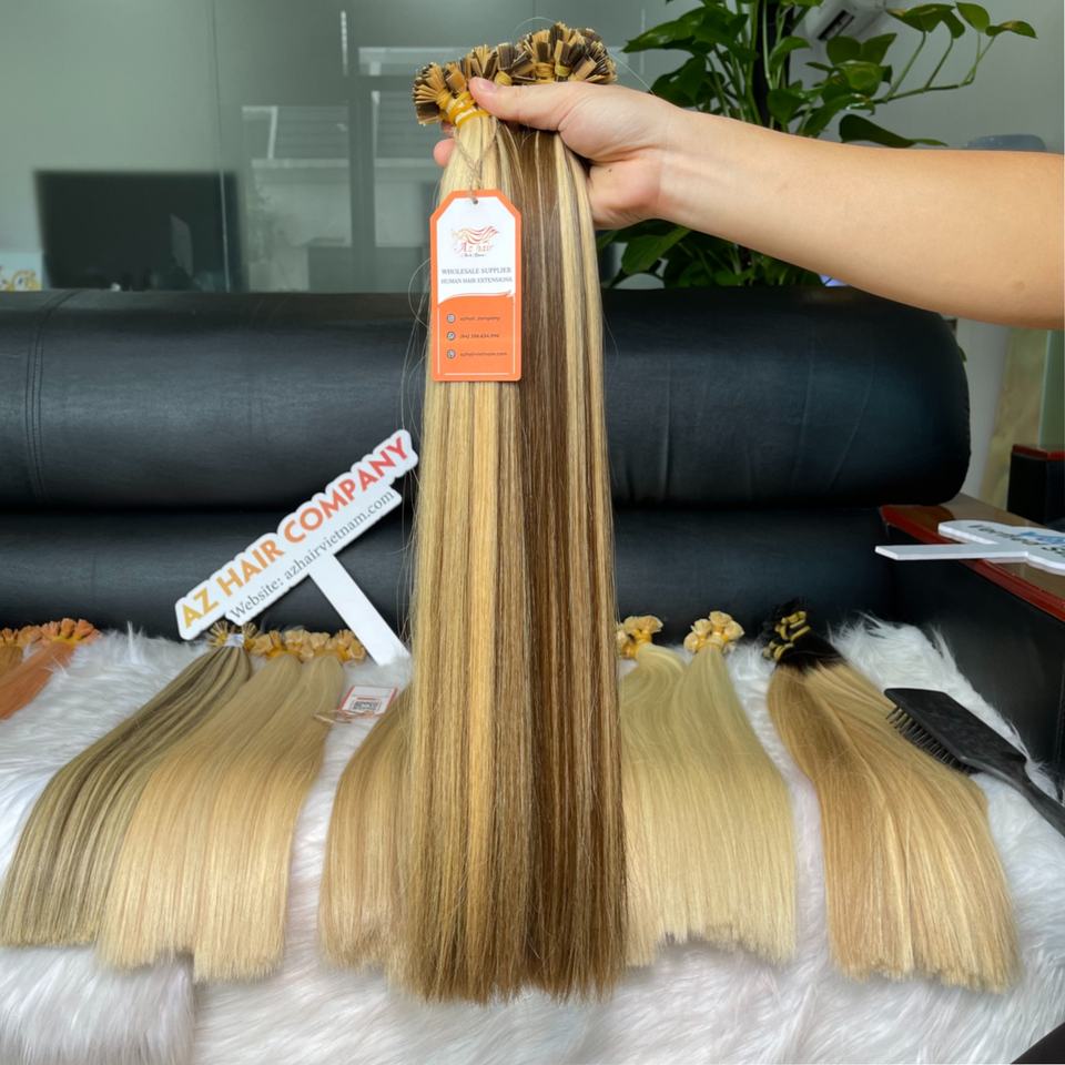 Cabello Humano Remy de Alta Calidad, Super Double Drawn, Puntas Gruesas, Rubio con Mechas, Liso, con Punta Plana de Queratina
