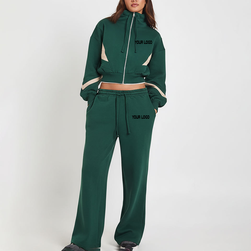 Conjunto Deportivo de Alta Calidad para Mujer, Estilo Urbano, Bloques de Color, Parches, Cremallera, Top Corto y Pantalones, Manga Larga