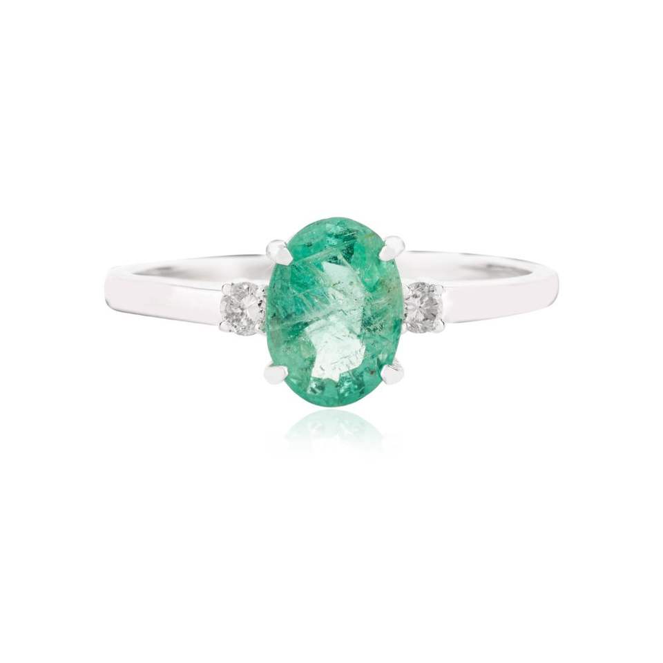 Anillo de Compromiso de Alta Calidad con Tres Piedras, Esmeralda Natural de Corte Ovalado Hecha a Mano y Diamante, en Oro Blanco Sólido de 14k