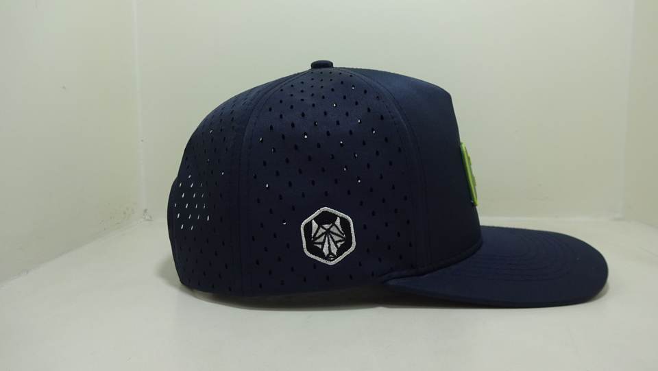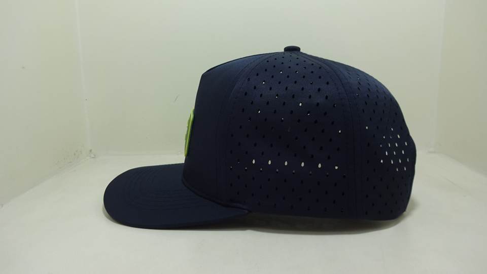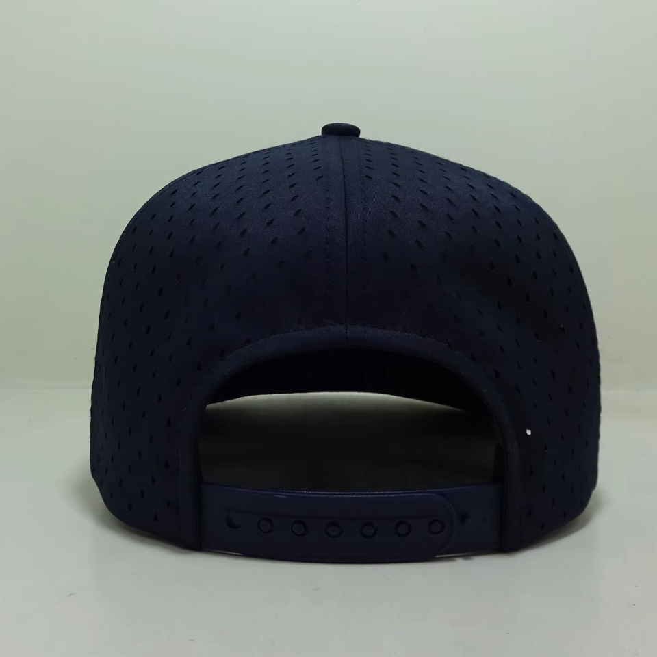 Sombrero de camionero de alta calidad, logotipo de Parche de goma personalizado, sombrero de Golf de 5 paneles, Gorras impermeables de malla con agujero cortado con láser, gorra deportiva OEM para hombres