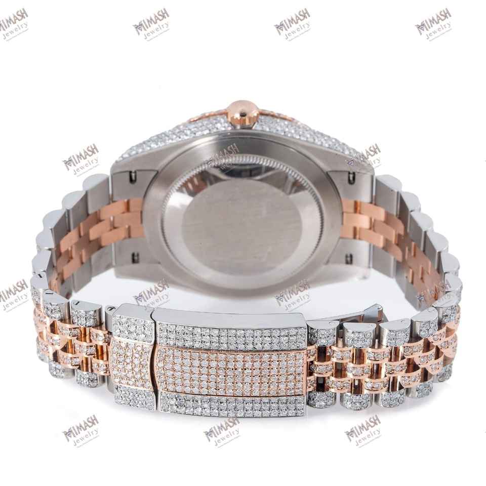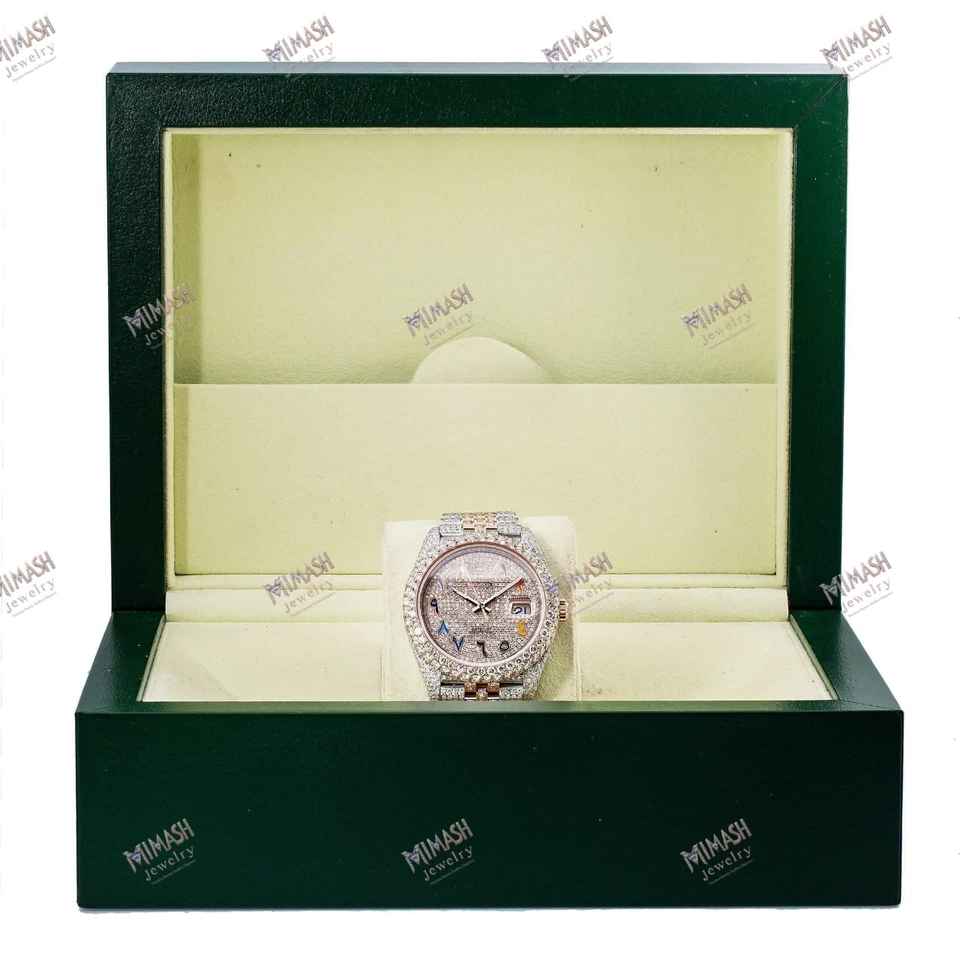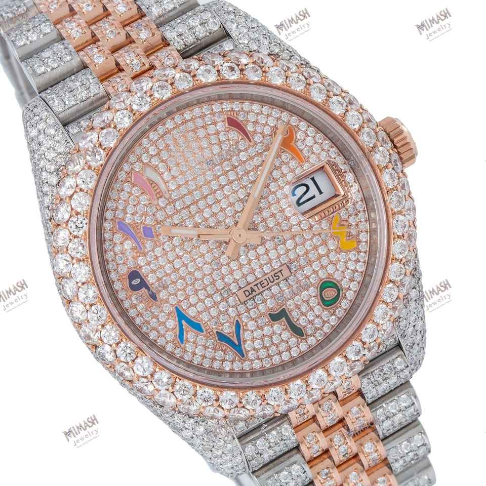 Reloj pavimentado de diamantes de moissanita de oro rosa de dos tonos de alta calidad, esfera de números arábigos coloridos, Reloj clásico con encanto estético moderno
