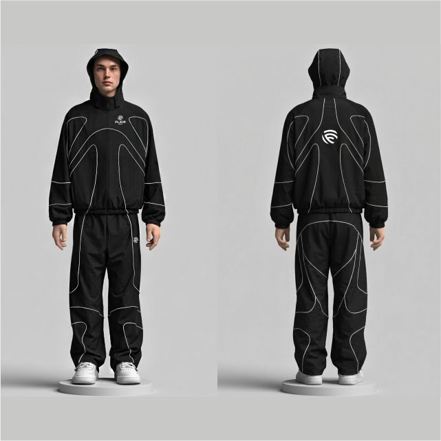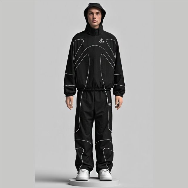 Conjunto Deportivo de Nailon Impermeable de Alta Calidad - Chaqueta Cortavientos con Capucha y Paneles con Diseño de Líneas Reflectantes Personalizadas y Pantalones Deportivos