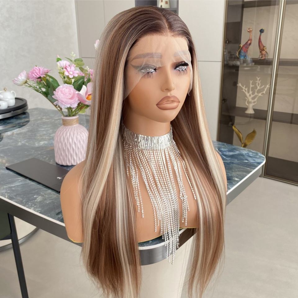 Pelucas de Cabello Sintético Flexible de Alta Calidad al por Mayor, 13x4, Largas, Naturales, Lisas, de 22 Pulgadas, con Frente de Encaje Transparente, Rubio Miel
