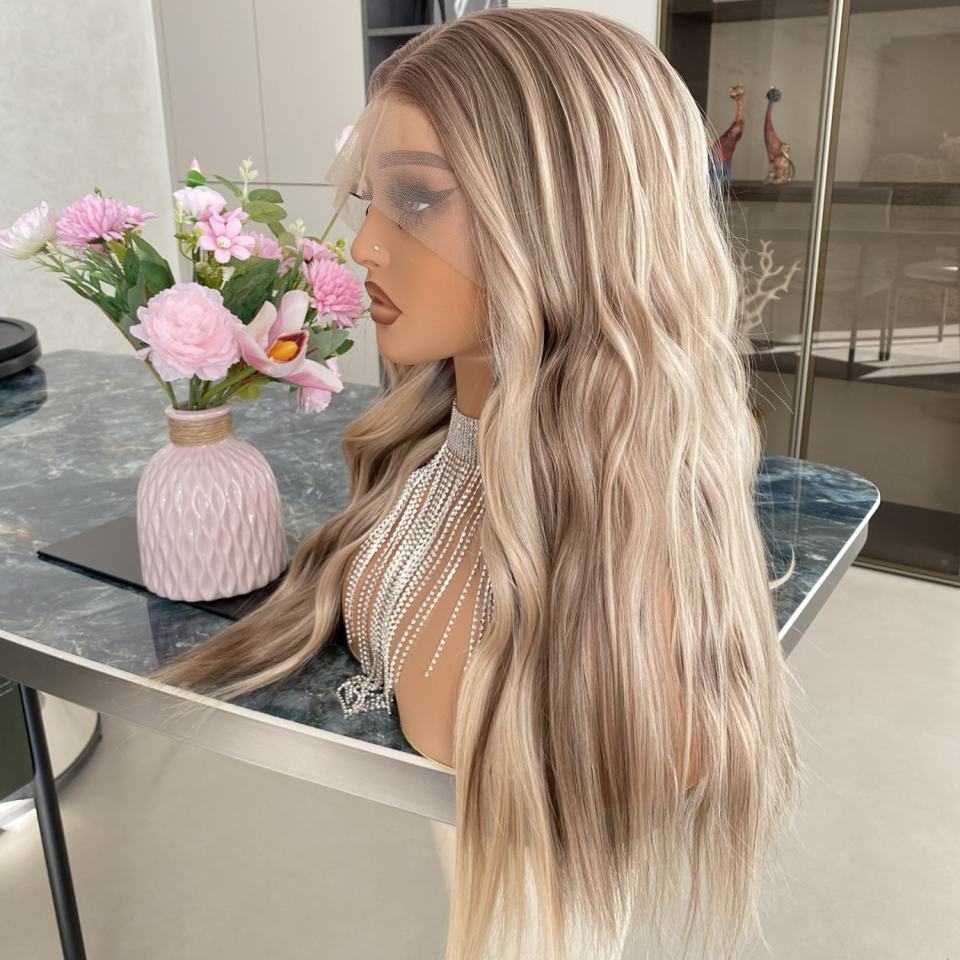 Pelucas Sintéticas de Alta Calidad al por Mayor, Estilo 20 Pulgadas, 13x4, Rubias con Reflejos, Pelucas Largas con Frente de Encaje Transparente
