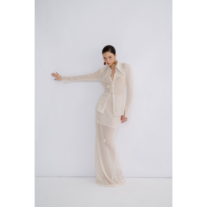 Camisas y blusas de mujer de alta calidad, ropa de mujer con cuello de hoja grande, blusa de manga larga de encaje Mira, tela de alta calidad de Vietnam