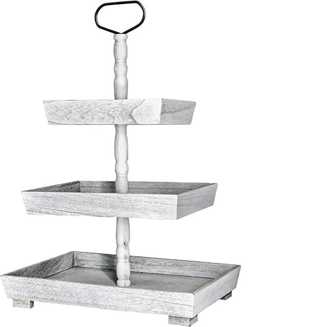 Placa de madera de alta calidad y soporte de pastel con mango de Metal, nuevo diseño, madera de acacia Natural, plato de 3 niveles, soporte para pastel, estilo americano