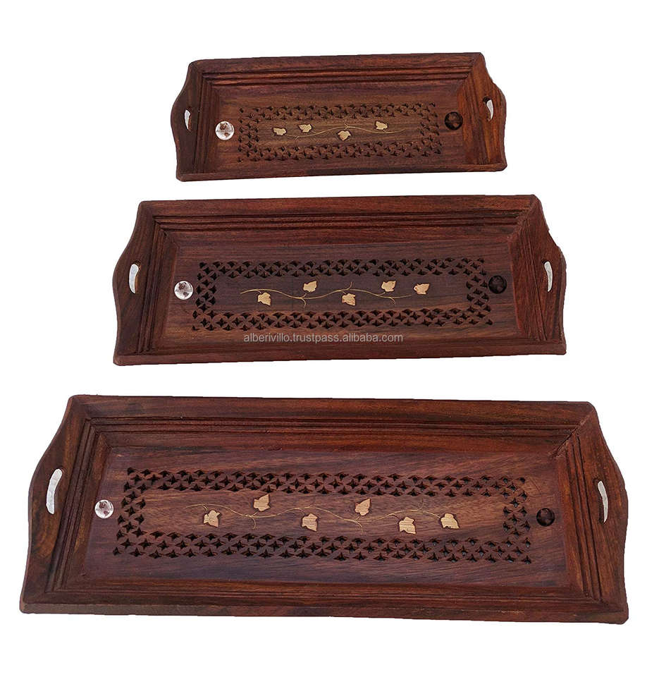 Juego de bandejas de comida de madera de alta calidad, bandejas de madera baratas personalizadas con asa, Juego de 2 + bandeja para restaurante y hogar