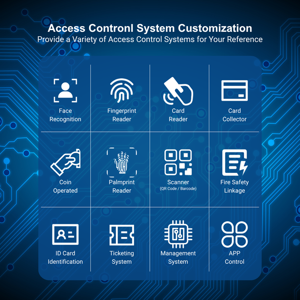Tarjeta RFID, Tarjeta de IC, Código QR, Huella dactilar, Reconocimiento facial, Sistema ESDTipo contol de acceso