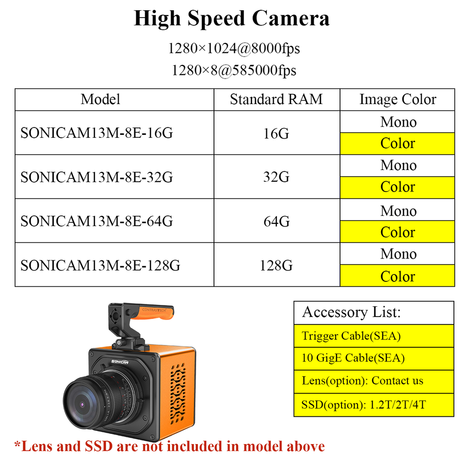 Cámaras de video de alta velocidad Transmisión de datos de alto ancho de banda Externa 1280x1024 8000fps 100ns Exposición Sensor CMOS Adquisición de datos