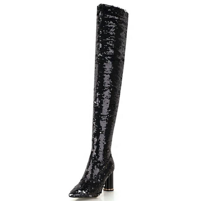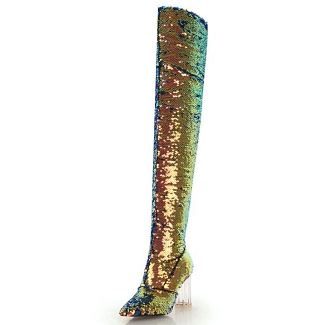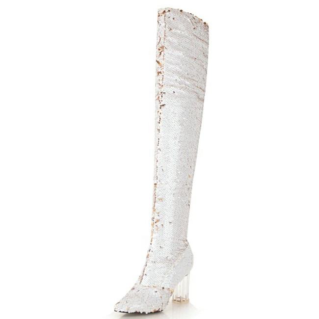 Botas Altas de Mujer con Tacón Cuadrado Transparente, Brillantes y con Purpurina, por Encima de la Rodilla, Botas Largas de Invierno para Mujer