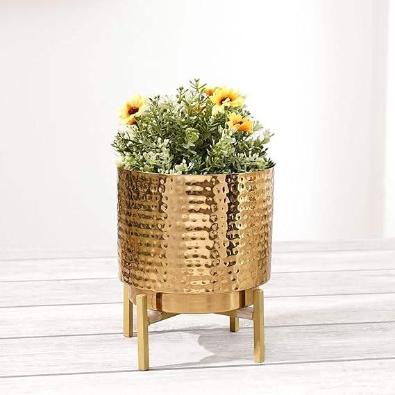 Macetas personalizadas de fábrica de gran oferta de alto estándar, vajilla chapada en oro, maceta martillada con soporte