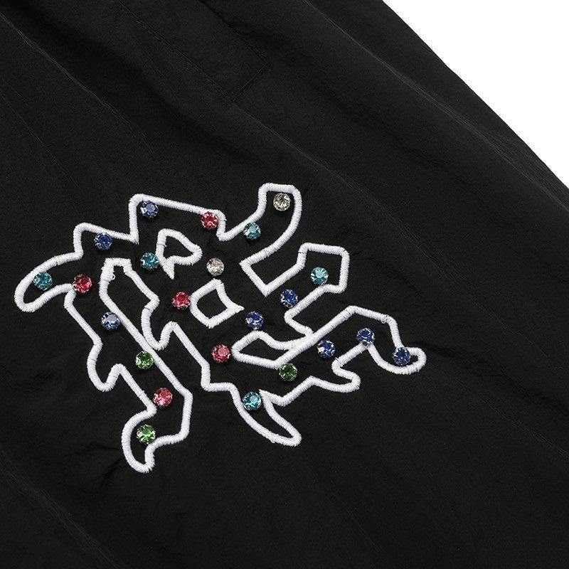 Pantalón de lona de cintura media con letras bordadas de diamantes de imitación, estilo vintage, casual y holgado, de corte recto, de moda urbana.