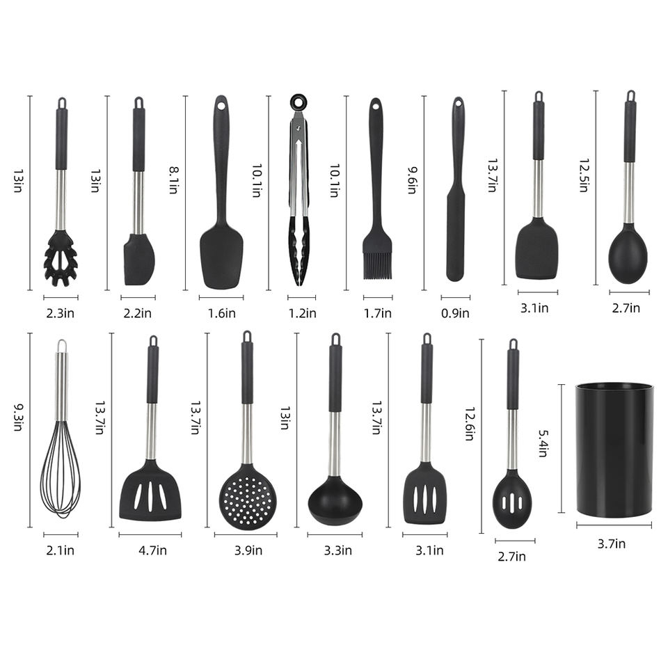 Contenido del set2:Juego de espátulas Turner, pinzas para alimentos, cuchara ranurada, batidores de huevos, cuchara espumadera