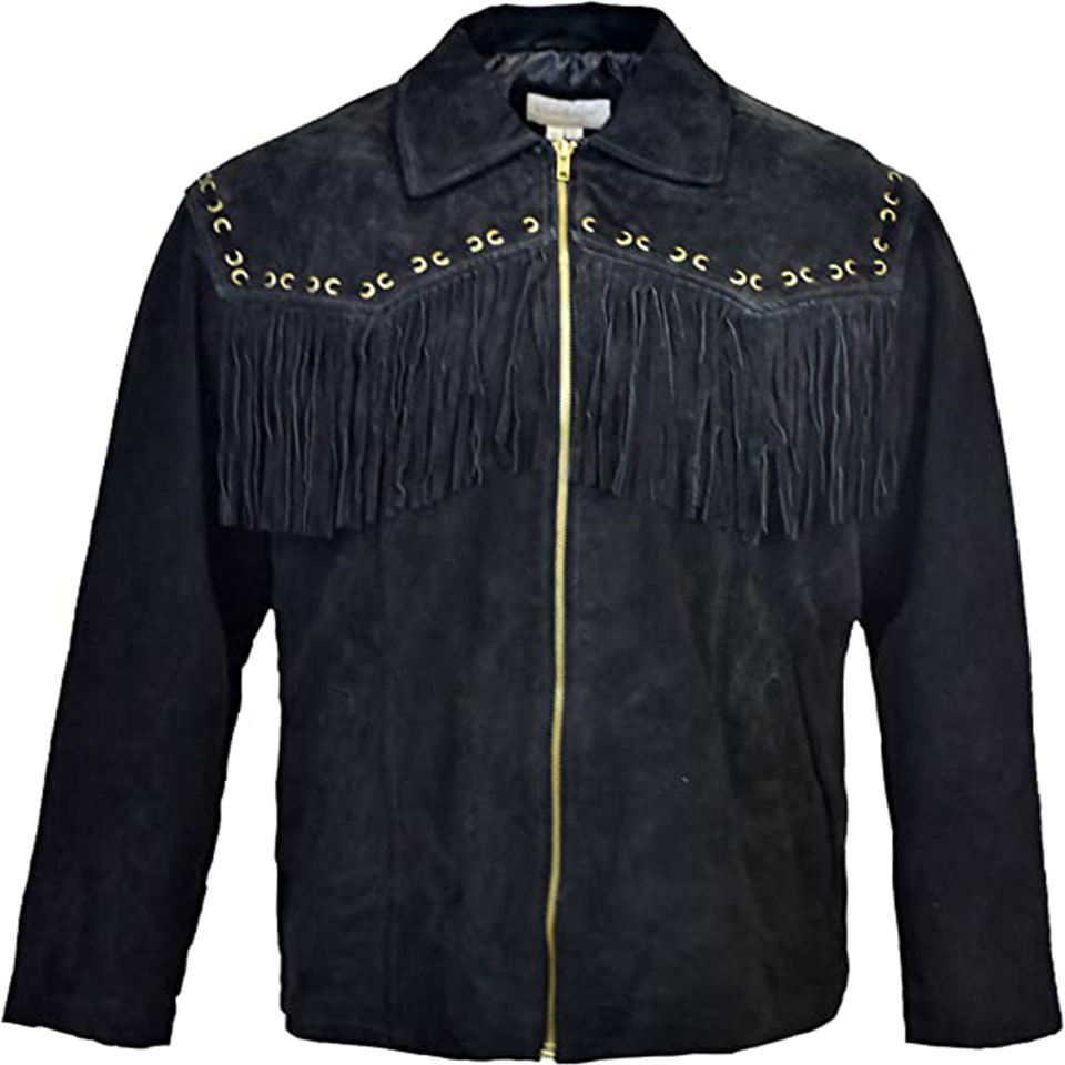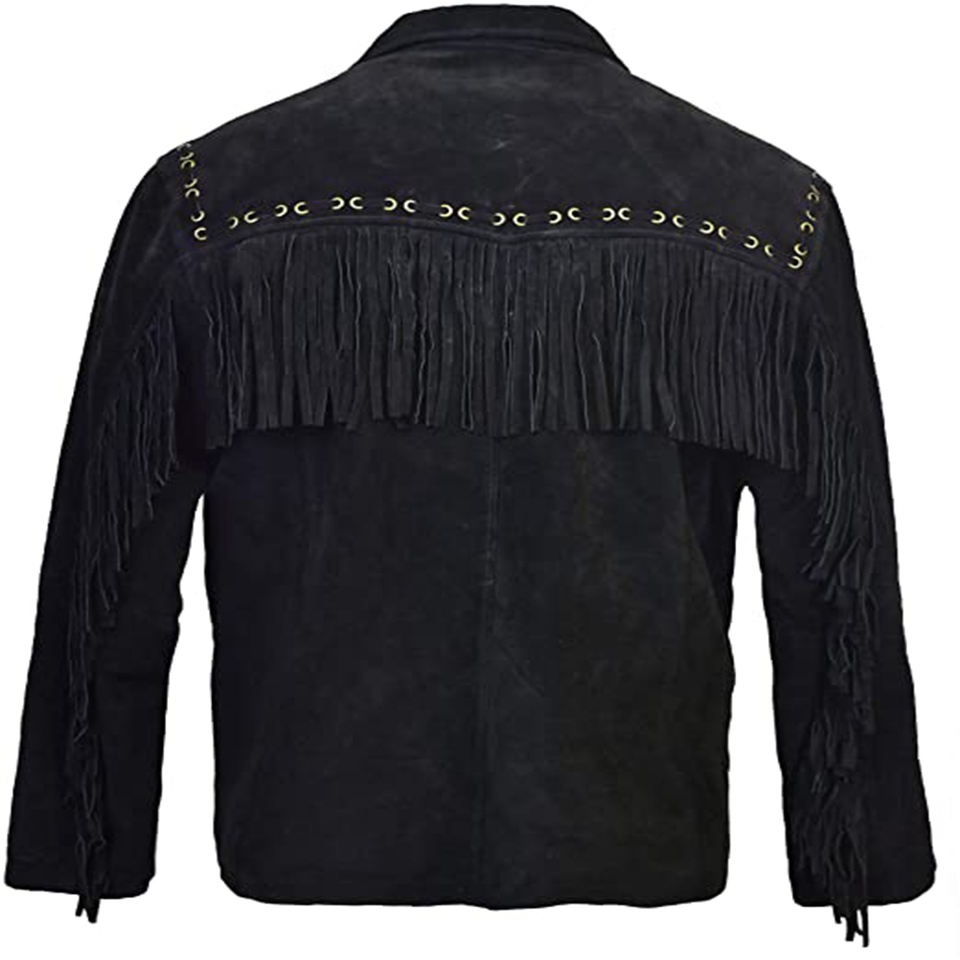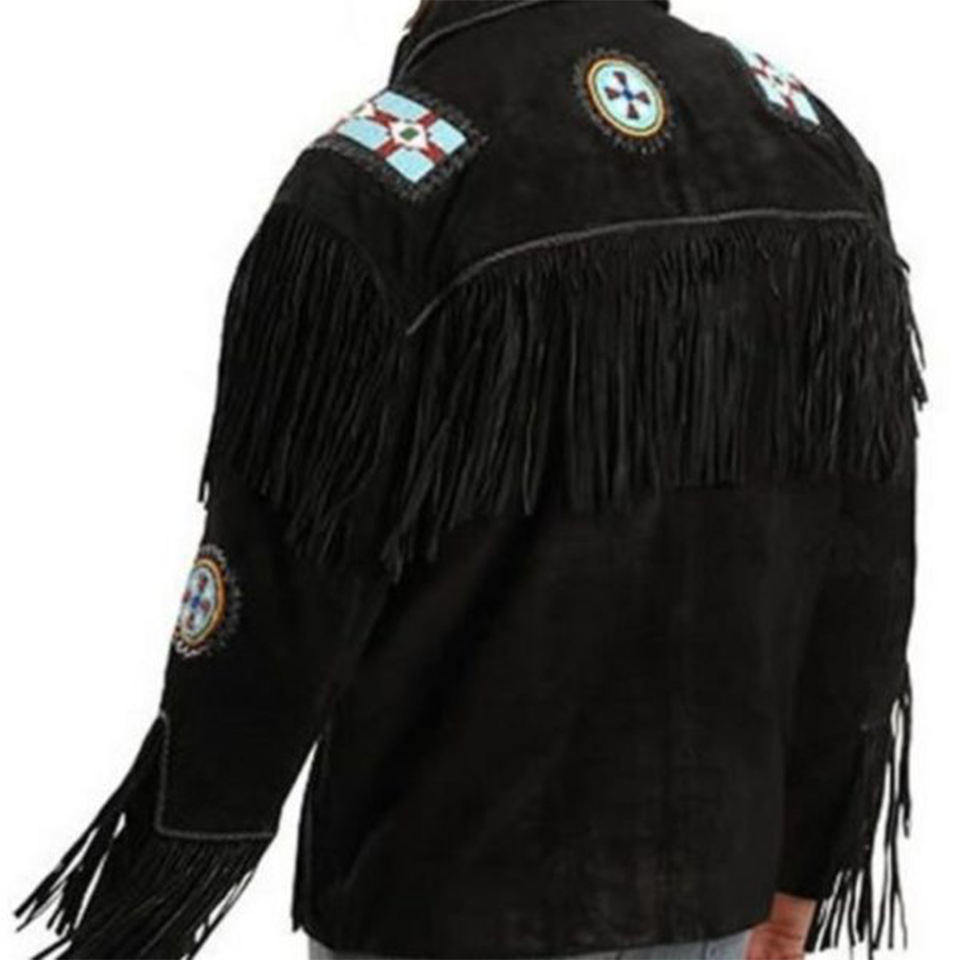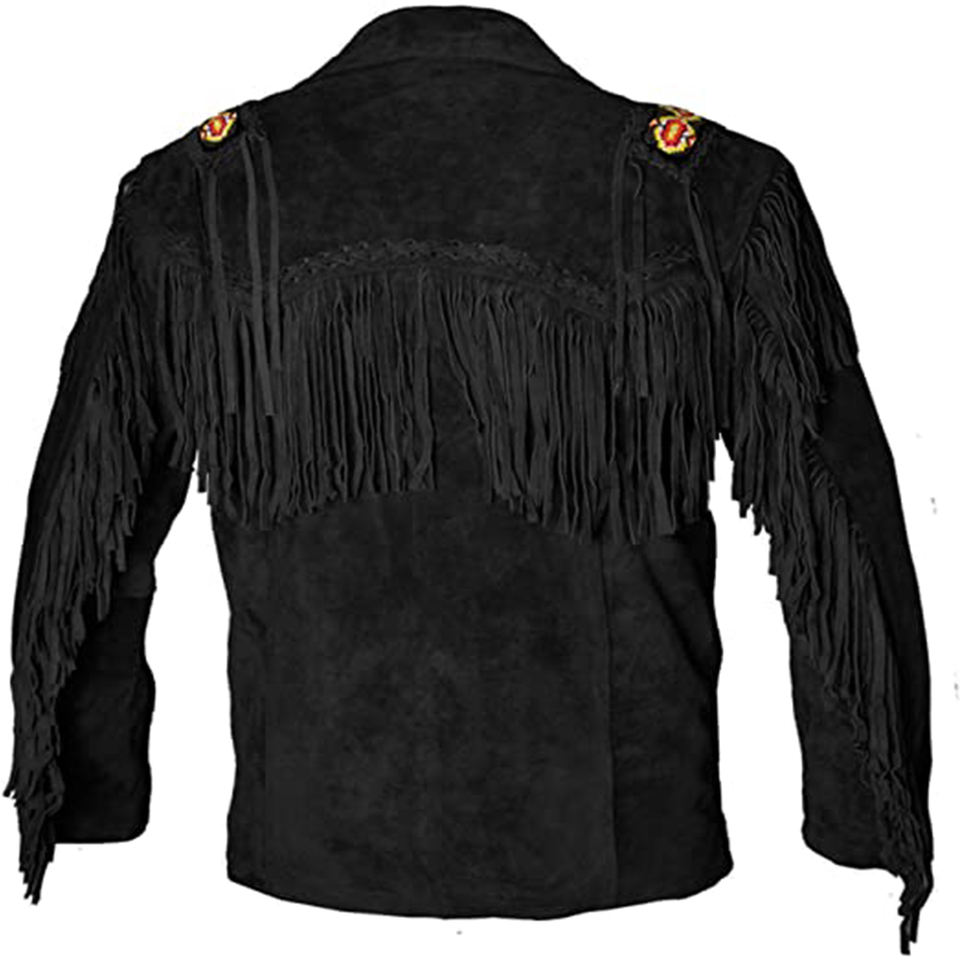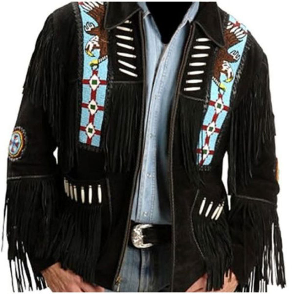 Chaqueta de cuero de vaca con flecos y cuentas para hombre, alta calidad, estilo occidental, vaquero, negro, águila