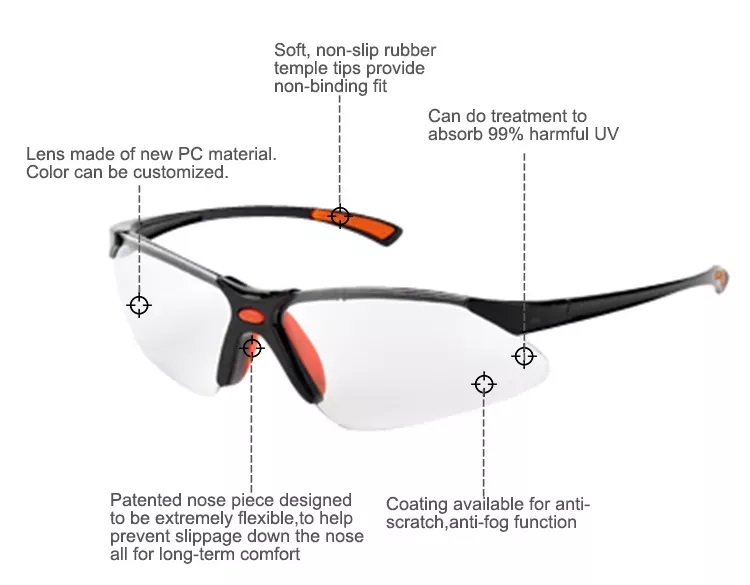 Gafas de protección UV antiarañazos de alta visibilidad, lente de PC de policarbonato, protección ocular para seguridad en el trabajo, características antiimpacto