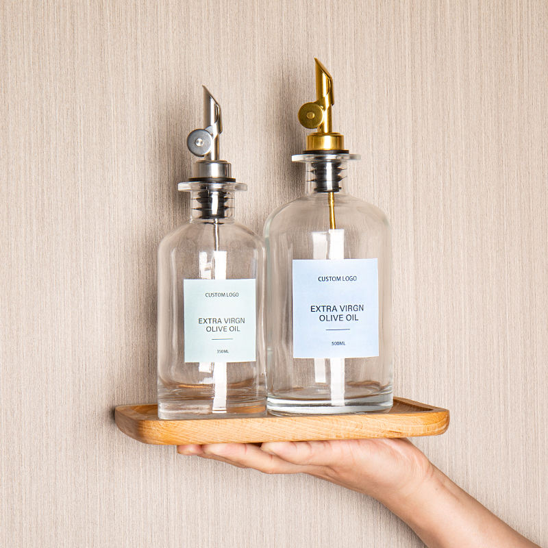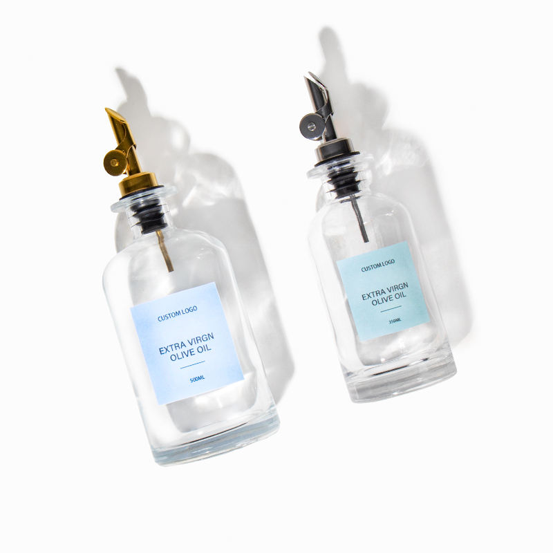 Botella de aceite de oliva de vidrio transparente personalizada automática de gama alta de 375ml y 500ml con dispensador de boquilla y etiqueta personalizada