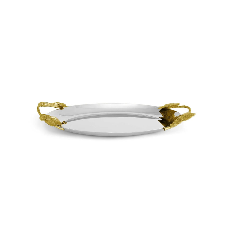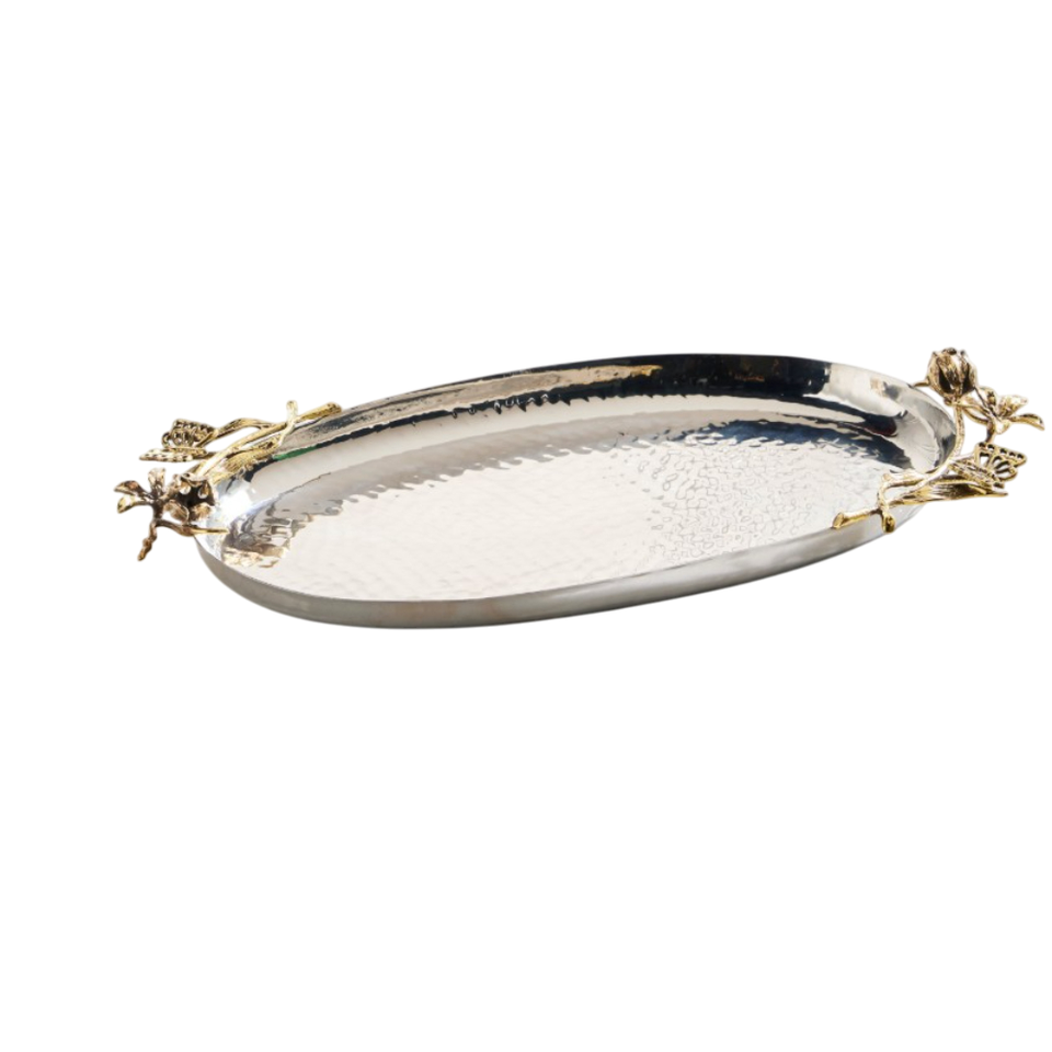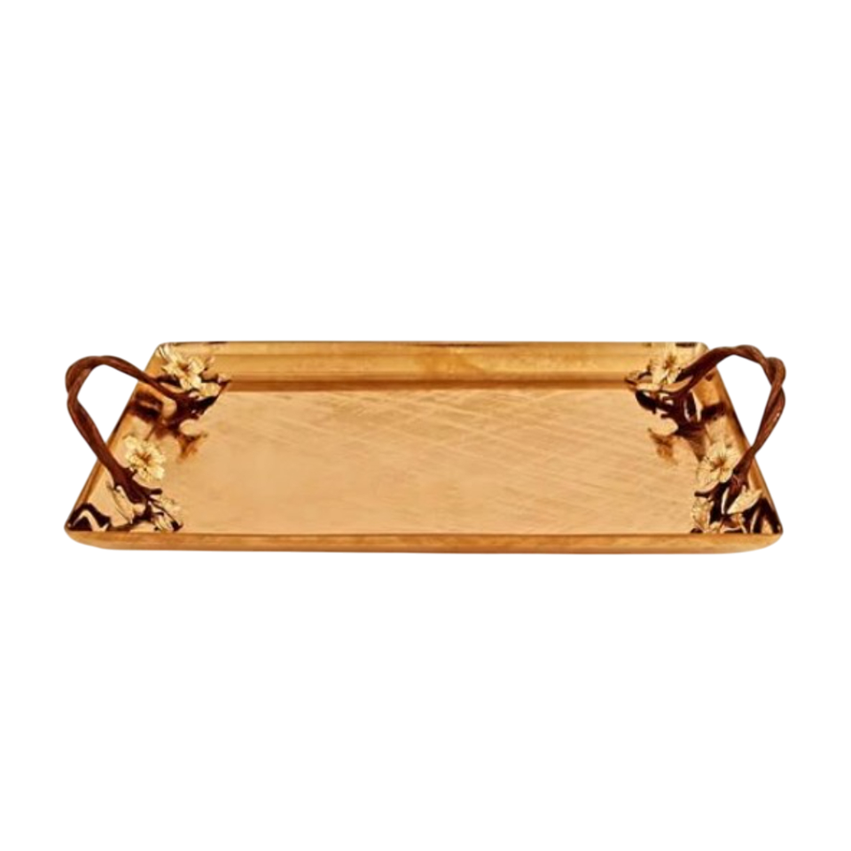 Bandeja de Servir de Metal Dorado de Estilo Europeo de Alta Gama, Plato Rectangular Decorativo para Alimentos con Asas Florales, Artículo de Decoración para el Hogar Hecho a Mano