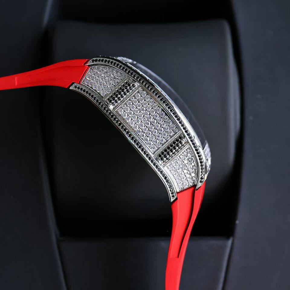Reloj tourbillon mecánico de alta gama con textura elegante, correa roja de 20 mm con moissanita y diamantes, y indicador de reserva de marcha.