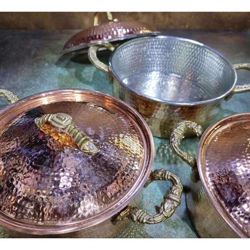 Gran demanda de platos calientes para servir, exportador indio, juegos de utensilios de cocina, olla segura para servir de cobre con alta calidad