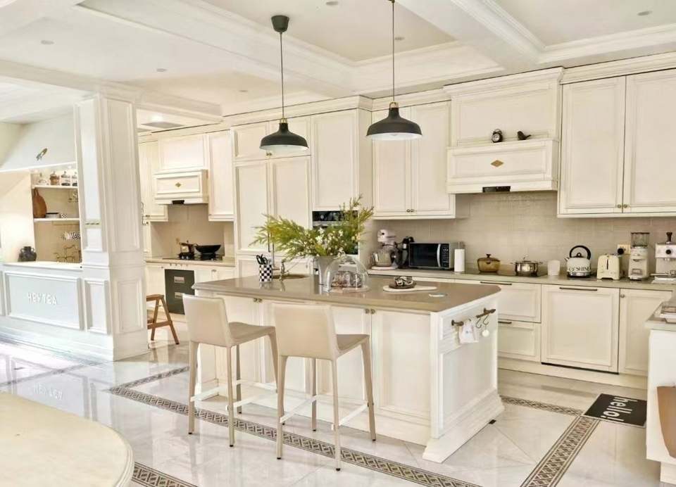 La fábrica de diseño de gabinetes de alta calidad proporciona gabinetes de almacenamiento alto de estilo francés crema sin marco lacados transparentes.