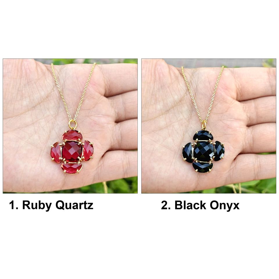 Collar de alta calidad con colgante de rubí y cuarzo tallado a cuadros, diseño de diseñador, chapado en oro de 18k sobre latón, con incrustaciones de múltiples piedras preciosas.
