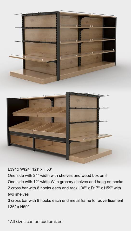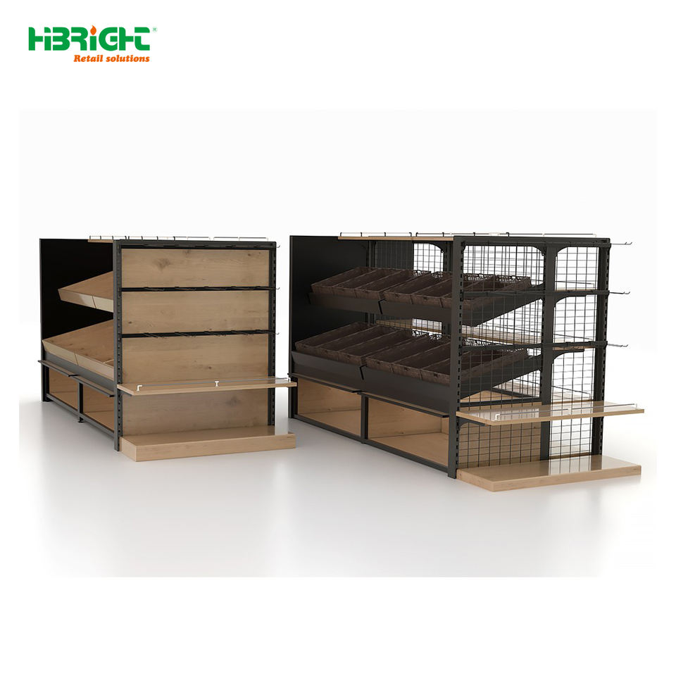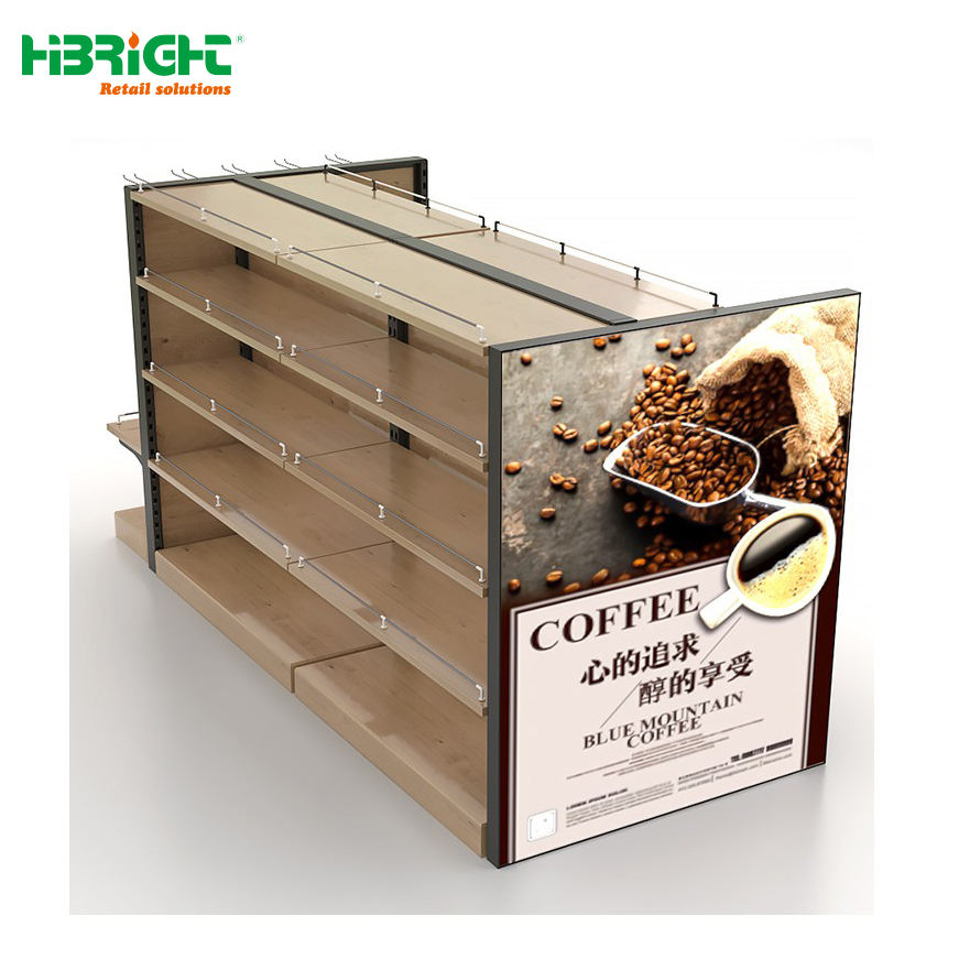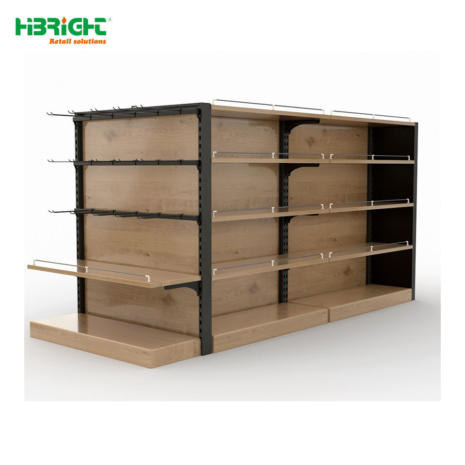 Góndola de Exhibición de Doble Cara con Acabado Rústico de Madera y Panel Final para Supermercados y Tiendas Minoristas