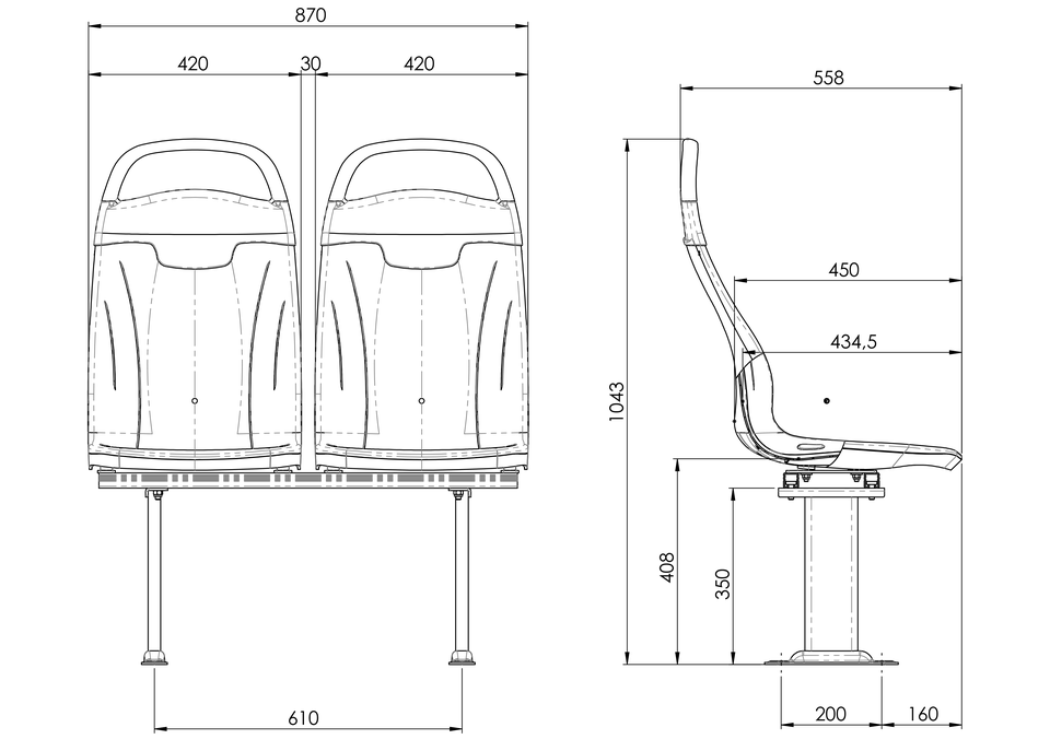 Asiento de autobús doble de lujo Aprobación más alta Chasis de metal Accesorios de autobús sin tapicería