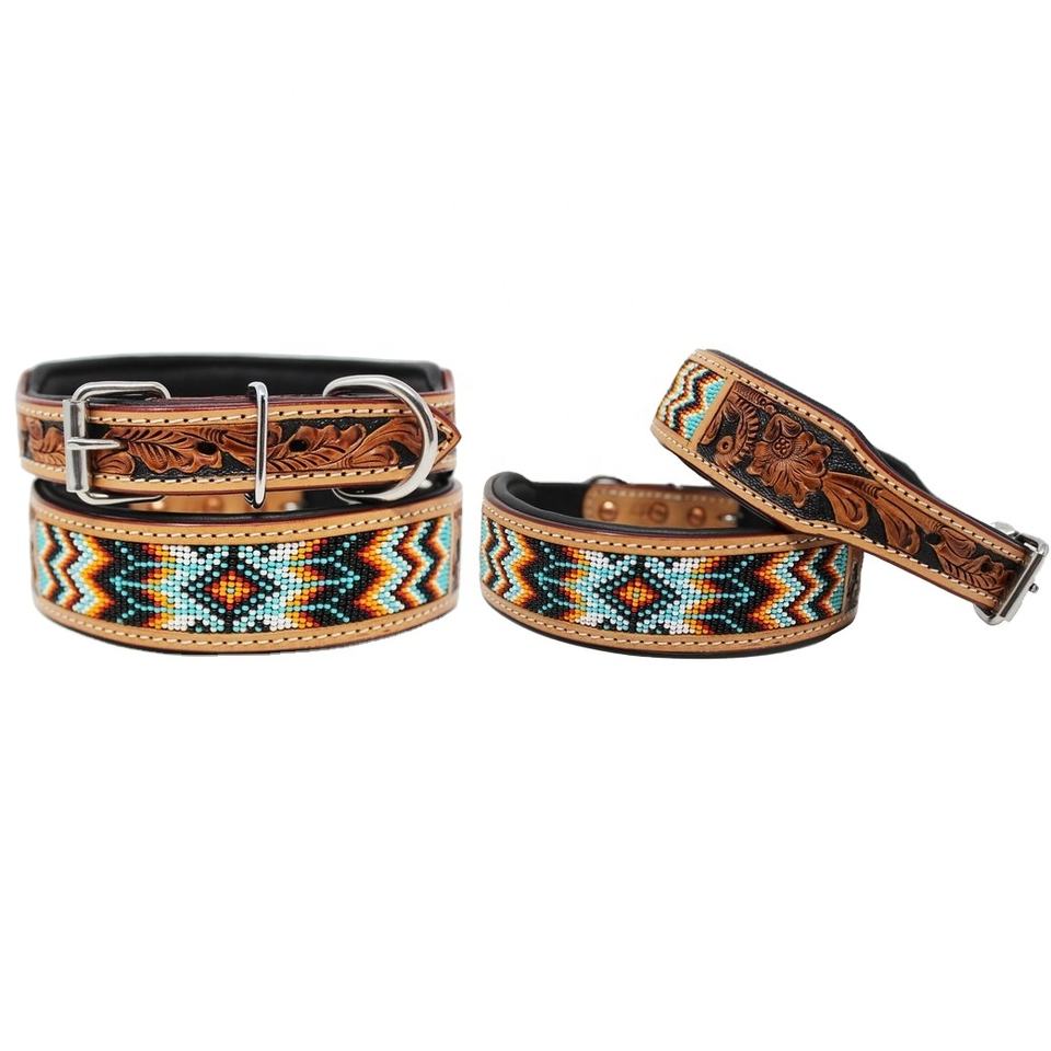 Collar de piel con relleno suave hecho a mano para perro, Collar de piel con tallado a mano y diseño de cuentas, hecho a mano