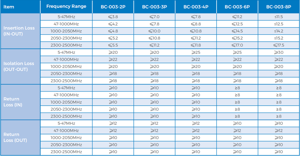 Pérdida de inserción (IN-OUT):≤ 3,9 \ ≤ 7,8 dB (desequilibrio)/≤ 6,2 dB (equilibrio)