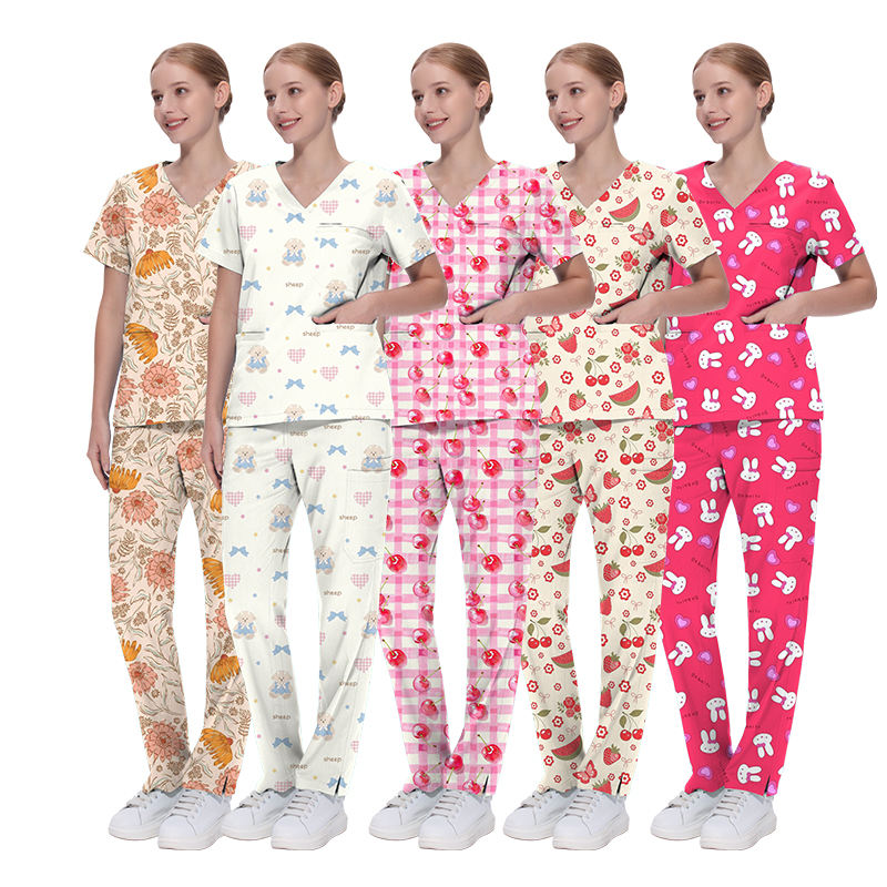 Uniformes de Enfermería Médica con logotipo personalizado de hospital de alta calidad, uniformes de dibujos animados impresos a la moda para mujeres, conjuntos de uniformes médicos